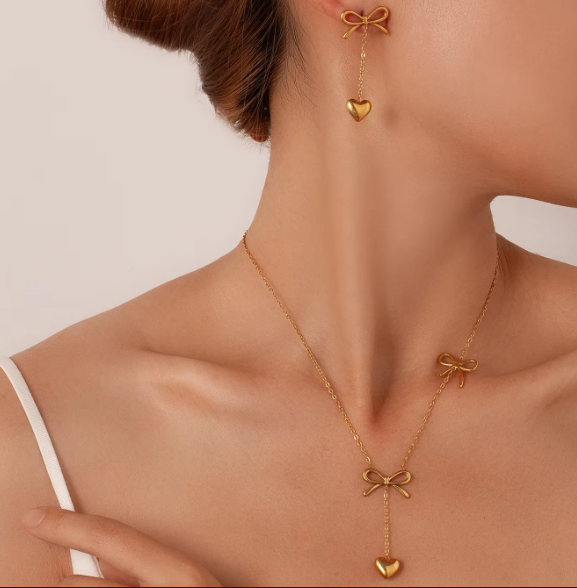 The Dual Bow & Dropping Heart Necklace is the perfect fusion of delicate charm and elegance. Featuring two dainty bows holding a dropping heart pendant, this piece symbolizes love and femininity. Crafted from 316L Titanium Stainless Steel, it’s designed for long-lasting beauty and durability.